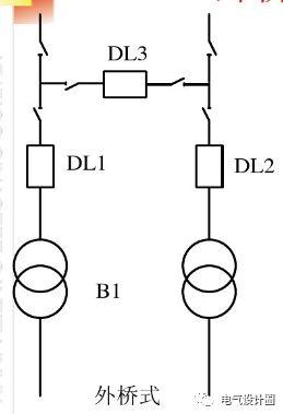 外桥接线的特点则与内桥接线相反,当变压器发生故障或运行中需要断开时,只须断开断路器DL1和DL2,而不致影响线路的工作。可是,当线路发生故障时却要影响到变压器的运行。因而,这种接线适用于线路较短且需要经常切换变压器的情况。一般在降压变电所应用较多。