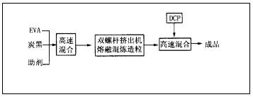 将EVA、炭黑、助剂等在高速混合机中混合后,加人到双螺杆挤出机中,在150-210℃熔融混炼,从口模挤出造粒,将上述粒料加人到高速混合机中高速搅拌并加入交联剂DCP,在60℃时出料。