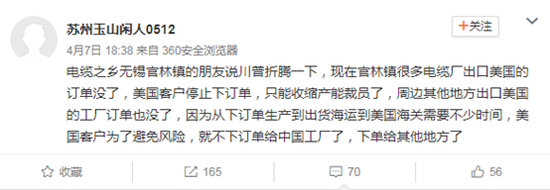 新浪财经讯 近日网传电缆之乡无锡官林镇很多电缆厂,由于贸易摩擦等原因得不到美国订单,纷纷缩产裁员。美国客户为了避免风险,不下订单给中国工厂。