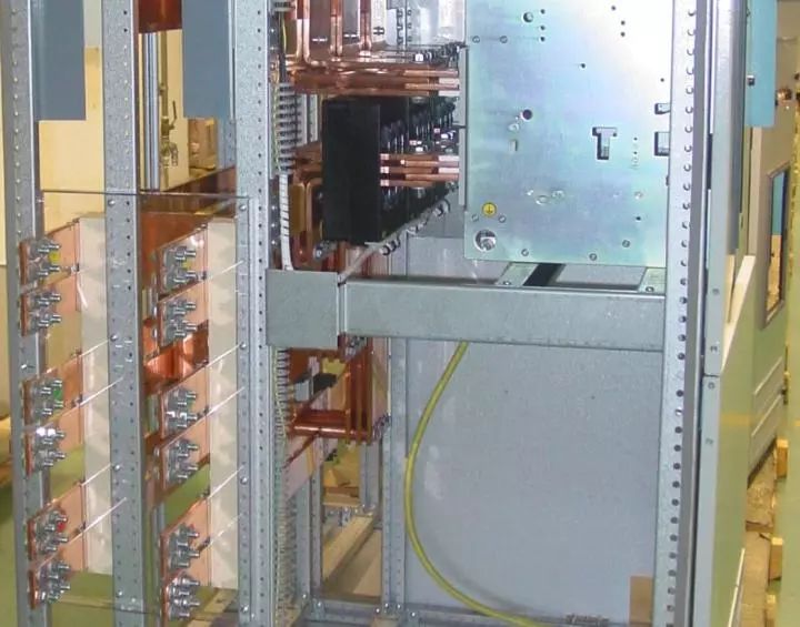 这是载流量为4000A的低压开关柜图片,我们能从右上角看到4000A的断路器图片。注意到图中的导线都是铜排,然而从断路器上垂下一根黄绿色的电缆,它就是接地线。尽管这根接地线如此之粗,但它还是多芯线。