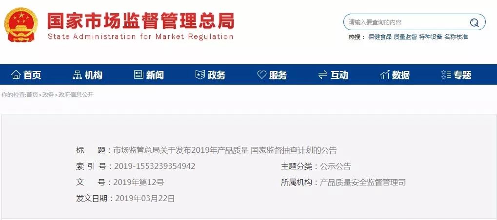 3月22日,市场监管总局官网发布公告称,为提高产品质量国家监督抽查工作的针对性和有效性,更好营造公平竞争的市场环境和安全放心的消费环境,2018年10月,市场监管总局面向社会公开征集2019年产品质量国家监督抽查产品目录建议,广泛征求相关部委、省级市场监管部门、行业协会、检验机构的意见。根据《中华人民共和国产品质量法》、《中华人民共和国消费者权益保护法》及《产品质量国家监督抽查管理办法》等规定,市场监管总局结合现有财政专项经费规模、现行标准和检验检测技术能力情况,充分采纳各方意见,将公众关注度较高的产品全部纳入国家监督抽查计划,突出涉及人体健康和人身、财产安全的产品,影响国计民生的重要工业产品,以及消费者、有关组织反映有质量问题的重点产品,组织制定了《2019年产品质量国家监督抽查计划》。