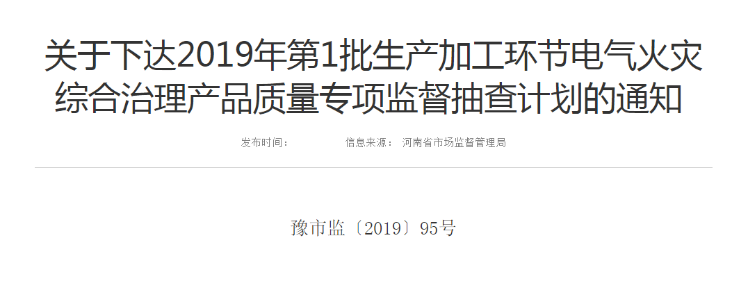 1.河南省2019年第1批生产加工环节电气火灾综合治理产品质量专项监督抽查计划表