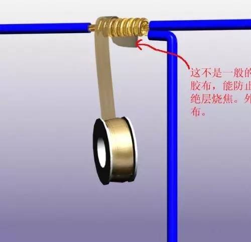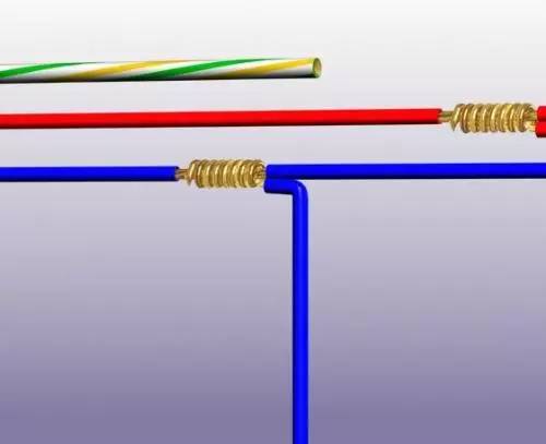 多用于吊项内,或比较高能的工程中,主线不能能弄断,符线绕主线6--8周,吊顶内的射灯,一路上要有很多灯就是这样接法,用防火胶布缠在里面,它的作用就是防止电打火烧坏东西,这是在吊顶内很重要。外面再用绝缘胶布缠绕。