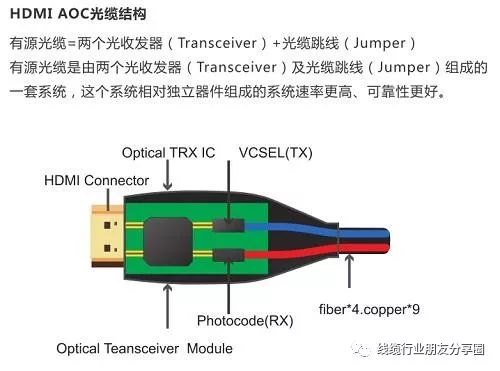 从HDMI 1.0到HDMI 2.1,信号的分辨率、帧率等都在提高,也就意味着信号的数据总量也跟着增加,4K信号的数据总量是1080p的4倍,如果你把线材想成管道,也就意味着你需要更大的管道来传输数据,我们传统使用的HDMI铜线的传导性,基本是由铜线的数量决定的,铜线越多,传导性越好,也就是说如果传输信号总量和速度增加的话,铜线的大小和重量也必然跟着增加,用过HDMI铜线的朋友应该都知道那重量不轻,从日常使用的角度来看,确实不太方便.偷偷告诉你,光纤HDMI的秘密.Active Optical Cable (AOC),号称下一代线缆/连接器的AOC,较铜线轻薄,因为其光纤的特性可以克服铜线的长度限制,AOC并不会因为线缆长度的增加而影响其性能表现(performance),例如:200米的HDMI光纤线缆跟1米的HDMI光纤线缆,其性能表现依旧是一样的,光纤所费比铜线高昂,但是并不是贵在线缆的本身,而是两端的光电组件和IC.