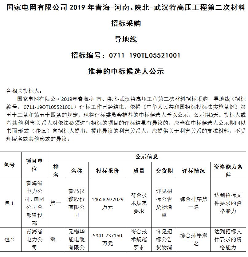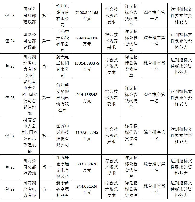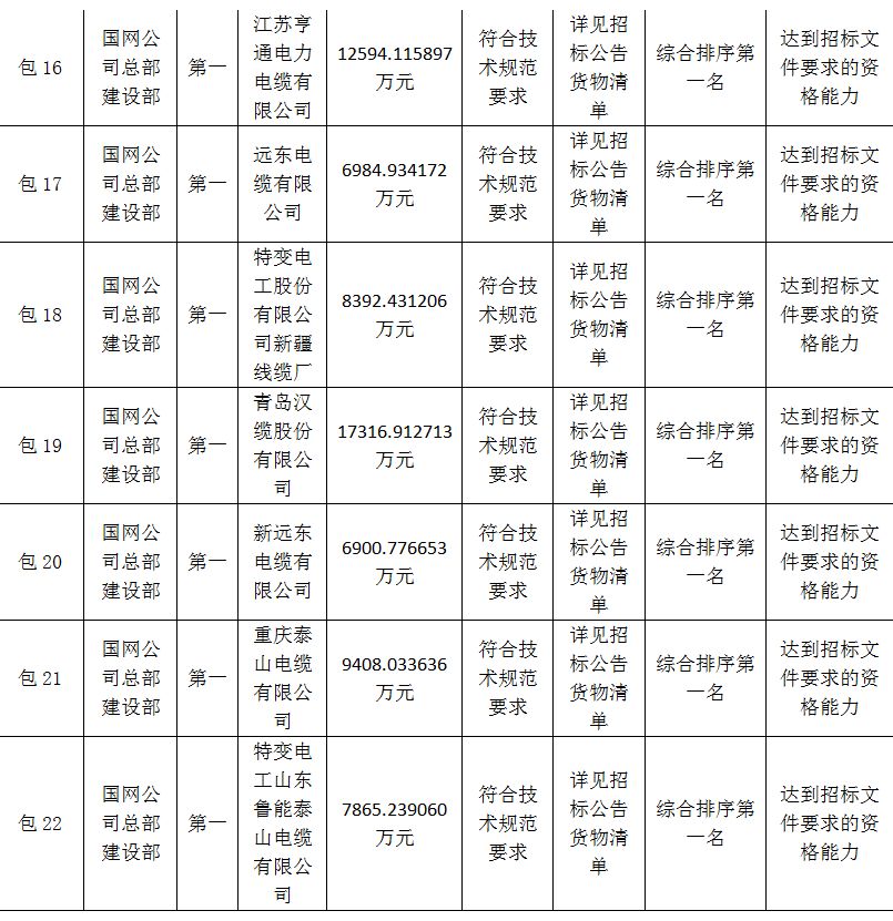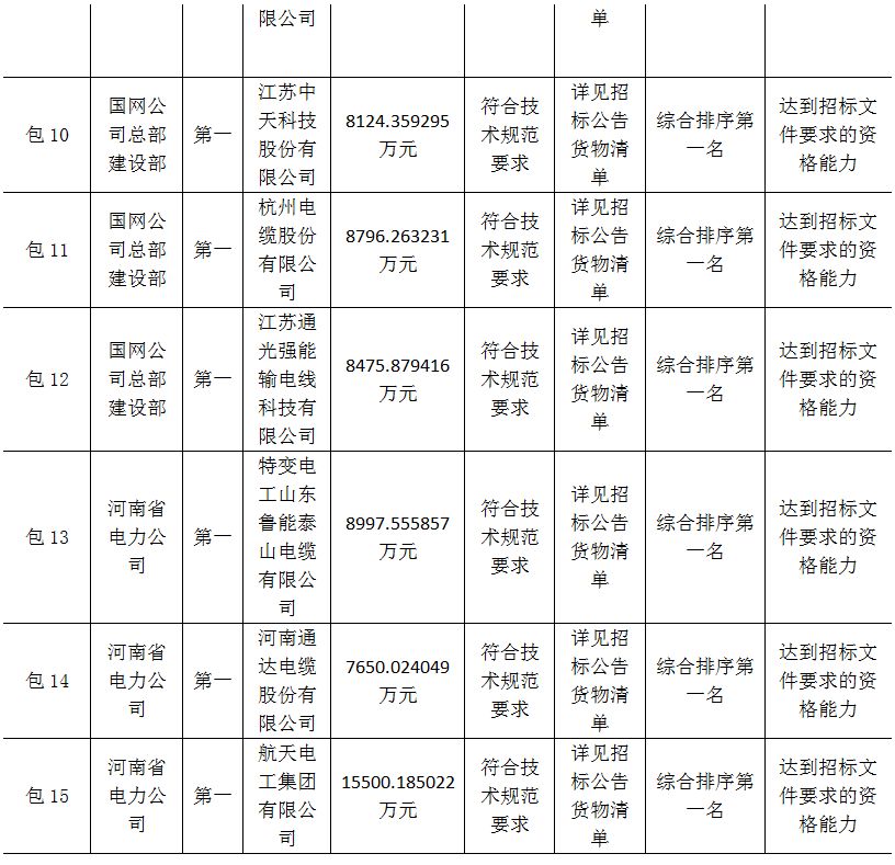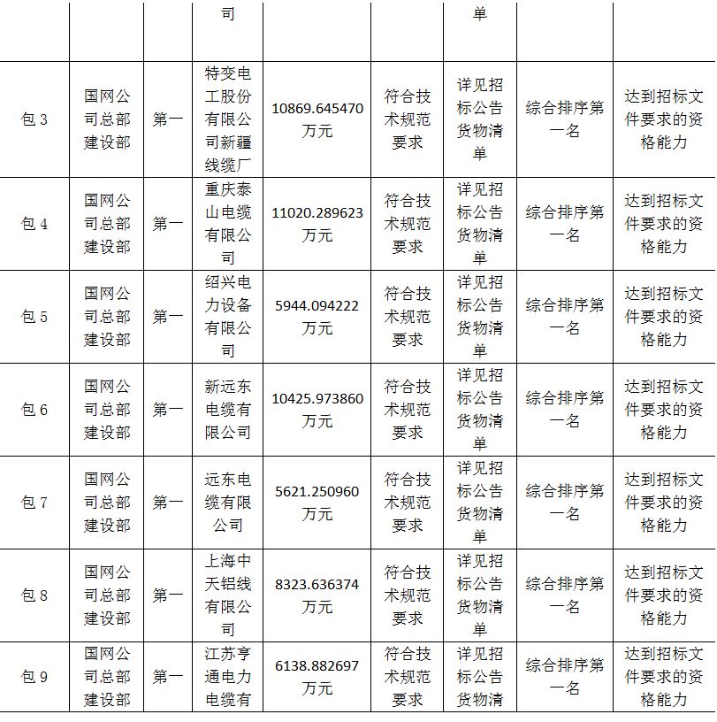 除去江苏通光强能输电线、河南通达电缆、常州特发华银、新余新钢、藤仓亨通光电均中1包以外,其余的线缆企业,如:青岛汉缆、无锡华能、特变电工新疆、特变电工山东、重庆泰山、绍兴电力、新远东、远东、上海中天、亨通电力、江苏中天、杭州电缆、航天电工,这13家大型缆企,均中2包。