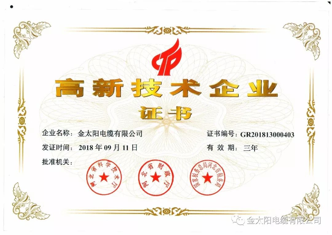 创新是引领发展的第一动力 ,科技是国之利器,国家赖之以强,企业赖之以赢,人民生活赖之以好。1月21日,河北省高新技术企业认定管理工作领导小组发布了依据全国高企认定办对河北省2018年第一批高新技术企业备案的复函(国科火字〔2018〕150号),将通过备案的695家高新技术企业予以公布的通知,金太阳电缆有限公司作为集制造、研发、销售、服务为一体的现代化创新型电线电缆企业,荣登榜单之中,可喜可贺。
