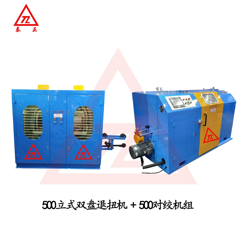 500立式双盘退扭对绞机,用于数据电缆超五类、六类、七类芯线对绞时同步退扭,是以前购置五类网络线设备厂家,将对绞机放线部分升级换代为六类、七类的最佳选择,本厂可将退扭机与任何生产的对绞机连动控制。该机具有结构紧凑,占地面积小,操作方便简单,退扭率准确,性能稳定等诸多优点。使用本产品后众多厂家网络线均能通过六类、七类的测试。