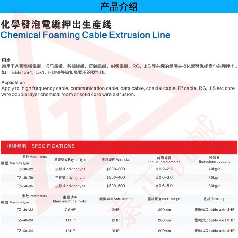 适用于通讯电缆,数据电缆,同轴电缆,射频电缆、CAT5E、CAT6、IEEE1394、DVI、HDMI等芯线的双层共挤化学发泡或实心芯线押出。
