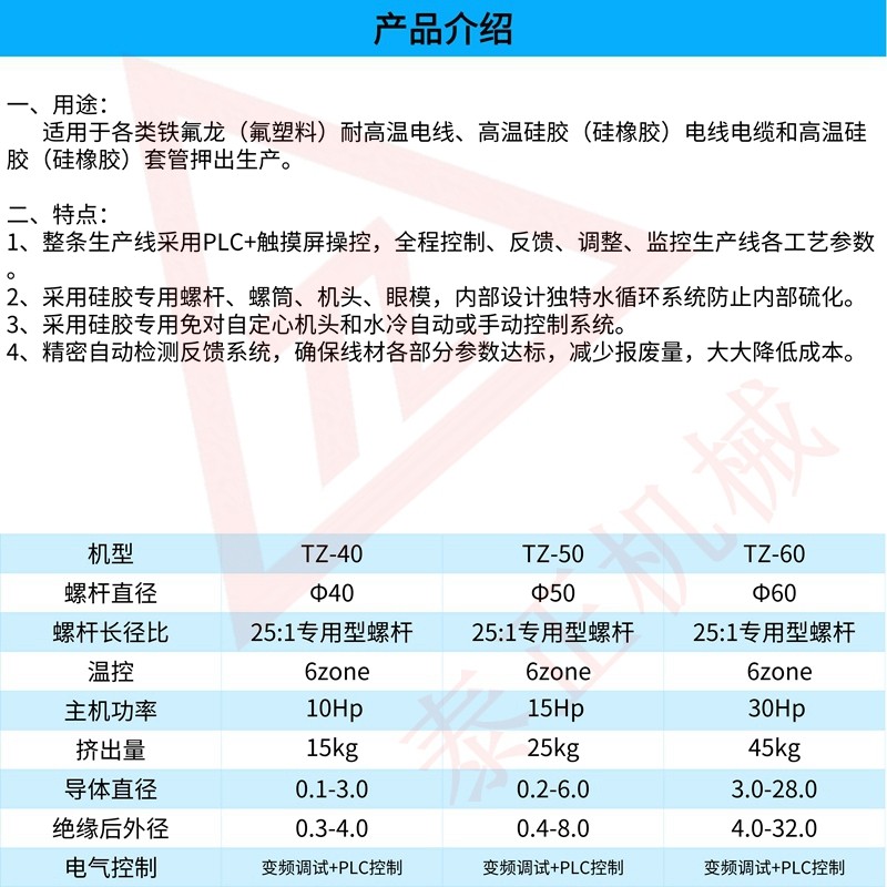 适用于各类铁氟龙(氟塑料)耐高温电线、高温硅胶(硅橡胶)电线电缆和高温硅胶(硅橡胶)套管押出生产。