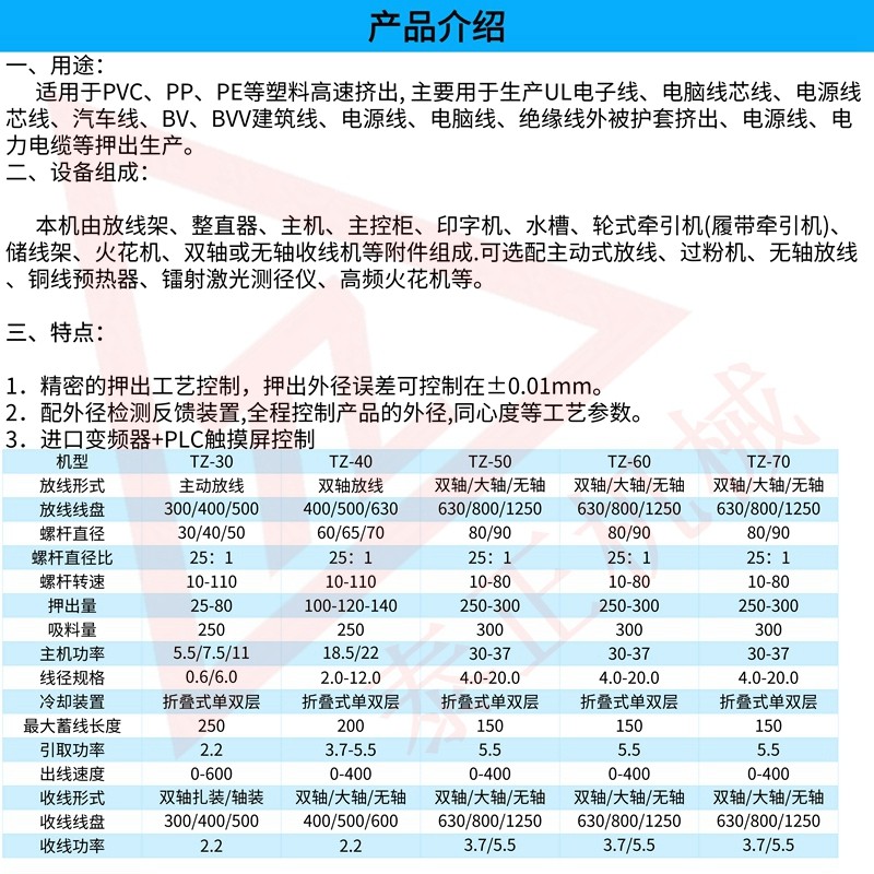 适应于PVC、PP、PE等塑料高速挤出, 主要用于生产UL电子线、电脑线芯线、电源线芯线、汽车线、BV、BVV建筑线、电源线、电脑线、绝缘线外被护套挤出、电源线、电力电缆等押出生产。