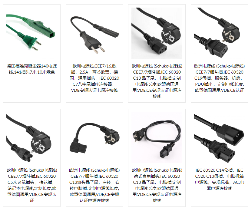 欧式装配式电源线和电源线由科尔顿电线生产符合欧洲标准和当前的范围和RoHS要求。F型术语,上面提到的欧洲电源线插头,是一种字母字母分类编码系统,主要用于快速识别欧洲使用的插头、插座和电源线组的电气配置。