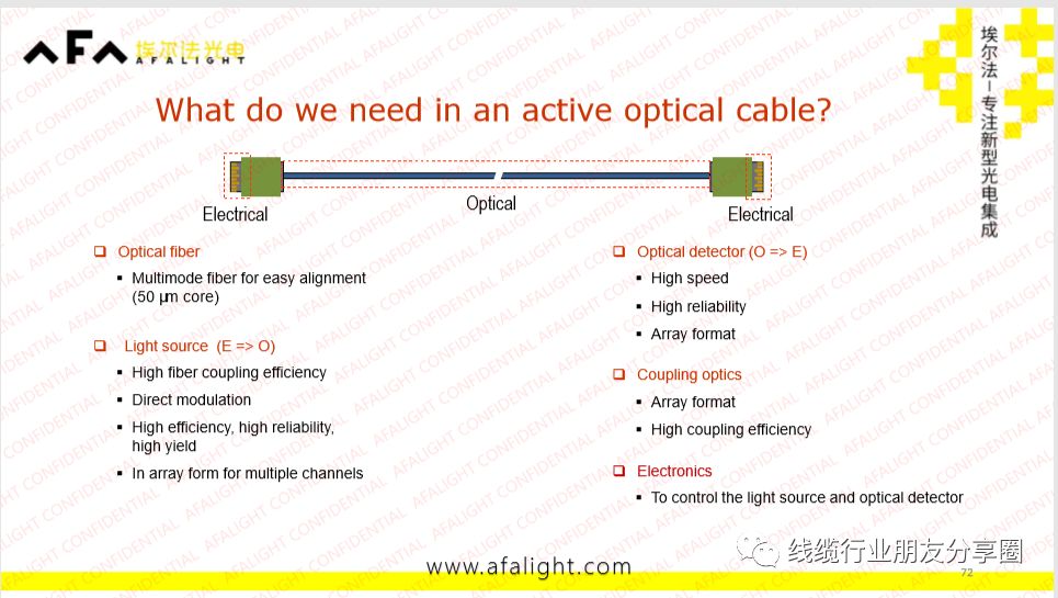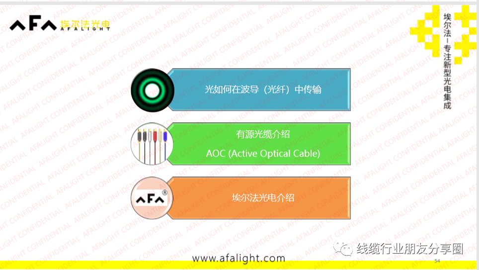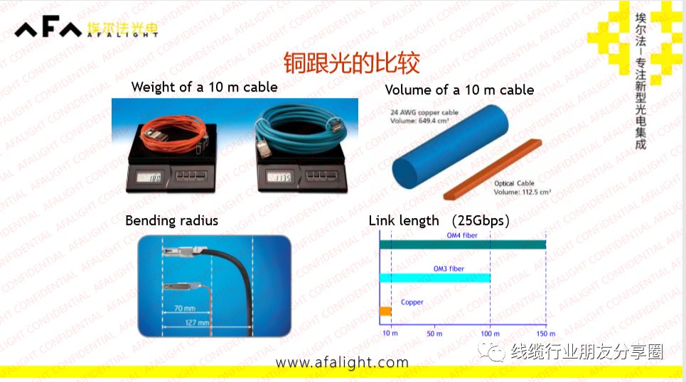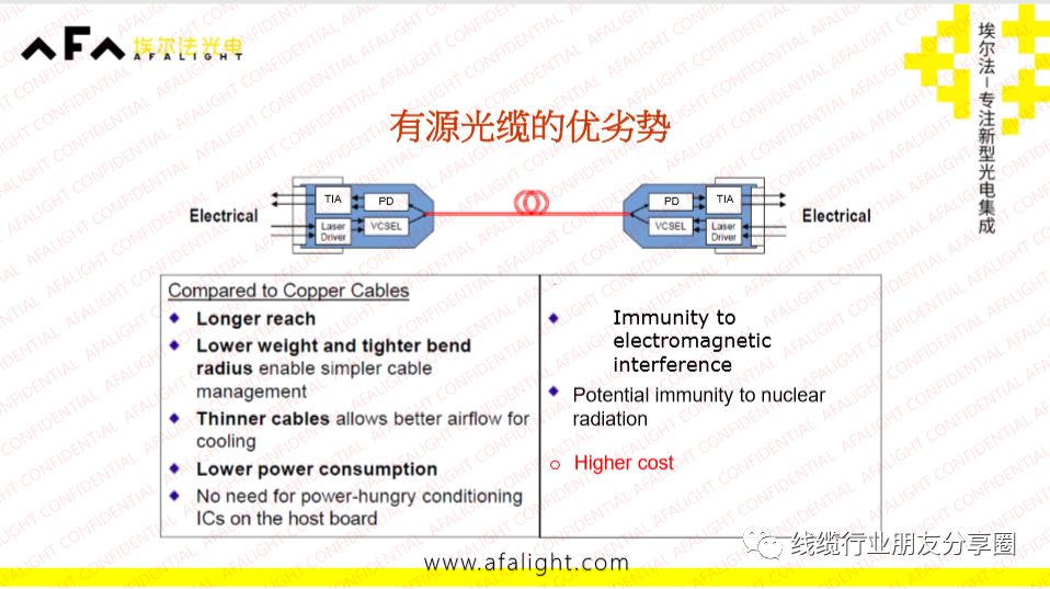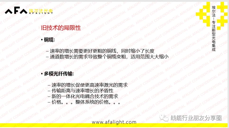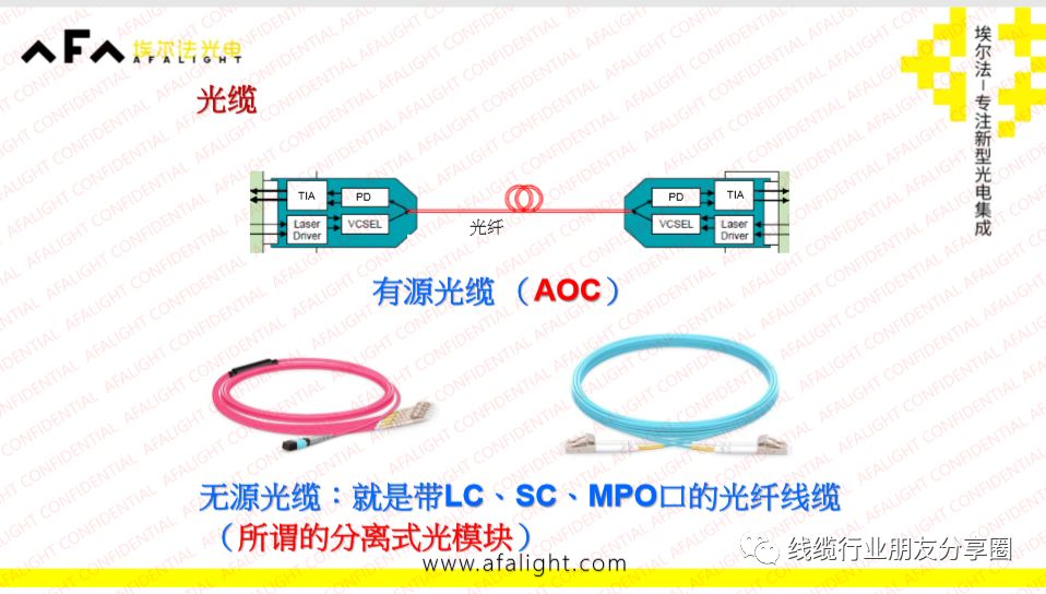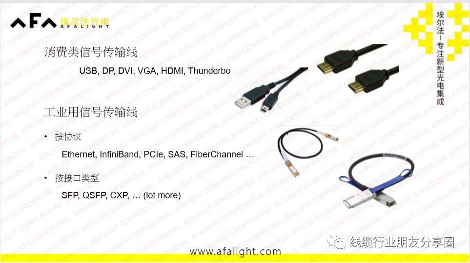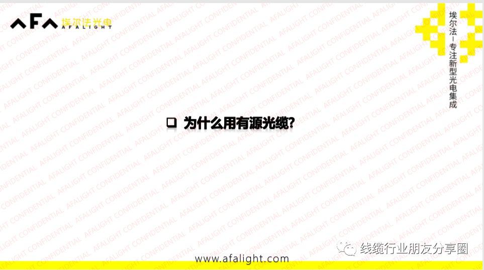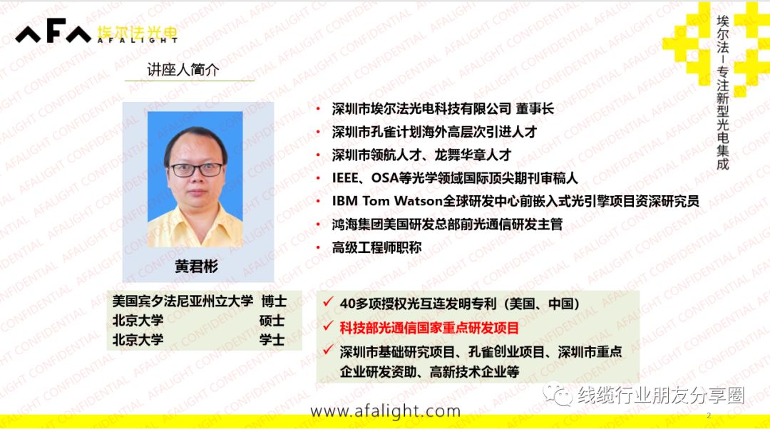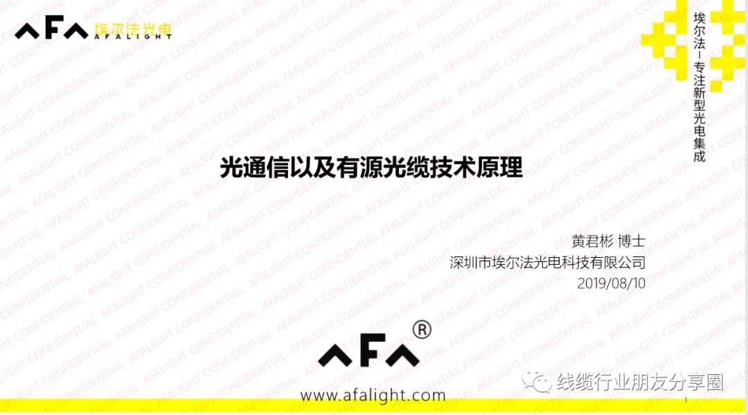 数据时代,高密度、高带宽应用越来越多,此时无源光缆或基于铜线的电缆系统就显得捉襟见肘,为保证传输的稳定性及灵活的应用性,用户迫切需求一种新型产品来作为高性能计算和数据中心的主要传输媒质,在这种情况之下有源光缆产品应运而生,8-10日一场遇见光通讯的技术盛宴在联颖集团新雅电线电缆深圳有限公司胜利召开,埃尔法光电创始人黄君彬董事长无私分享众多精彩干货,经过申请,我们今天分享给大家,需要PPT分享文件的请添加文中客服微信索取即可!或者文末留言邮箱地址,如果您在我们亚太线缆群,对应群主索取即可,谢谢!
