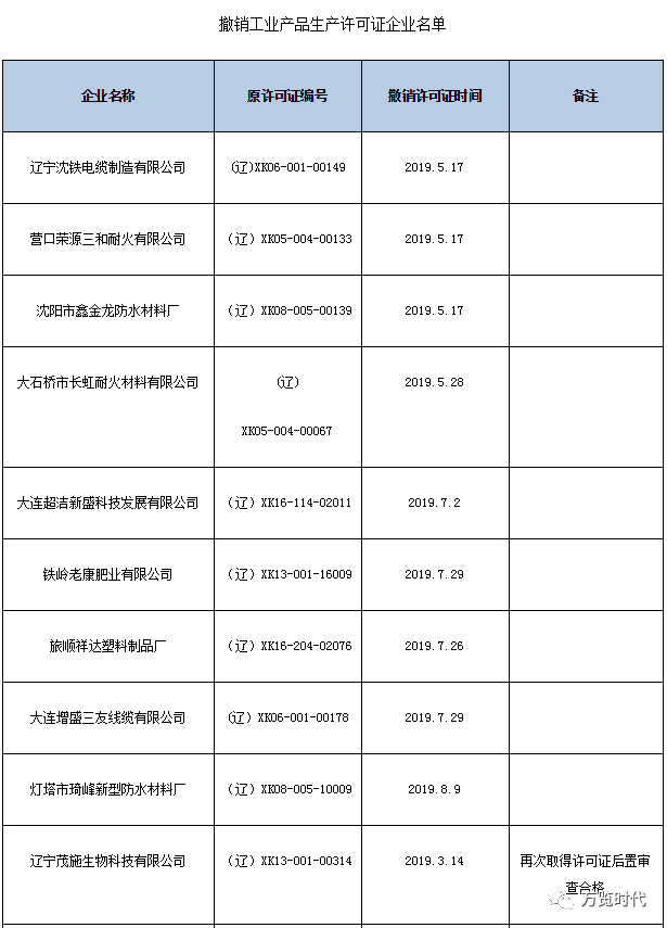 8月15日,辽宁省市场监督管理局网站发布关于对19家获证企业撤销工业产品生产许可证的通告。