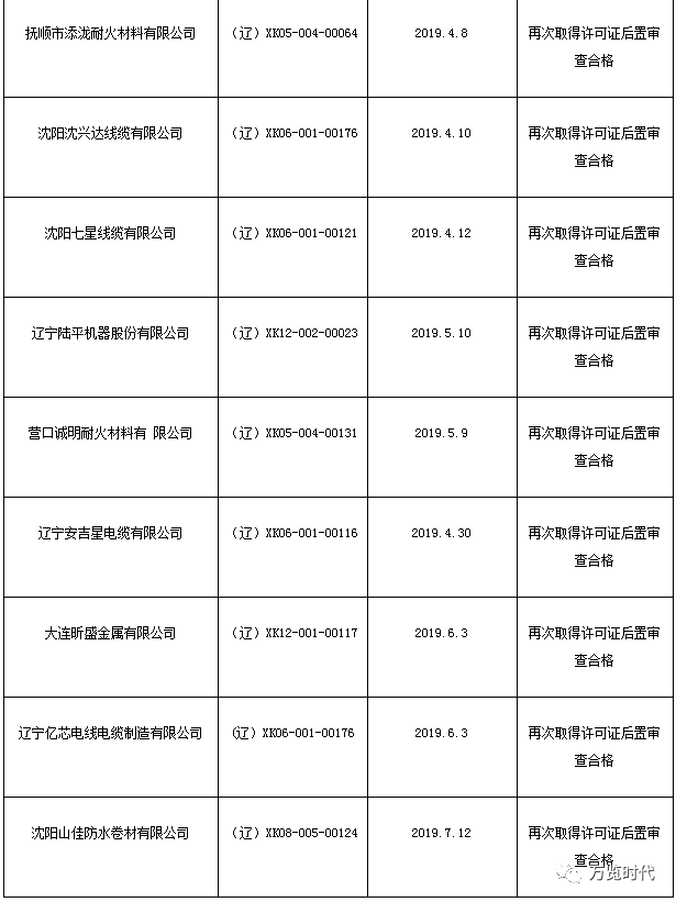 2019年2月-7月,根据《市场监管总局关于公布工业产品生产许可证实施通则及实施细则的公告》〔2018年第26号〕,辽宁省市场监督管理局对省级工业产品生产许可证获证企业开展后置现场审查,19家获证企业不符合《工业产品生产许可证实施细则通则》和《工业产品生产许可证实施细则》的有关要求,后置现场审查不合格。