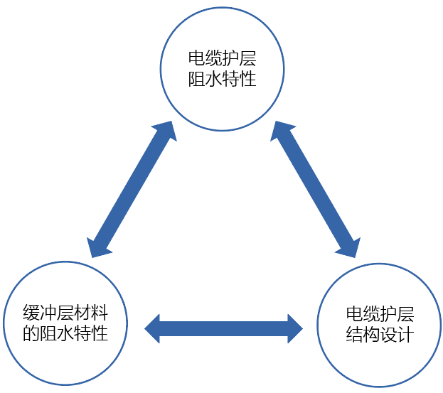 研究结果表明:高压电缆阻水特性、缓冲层材料阻水特性和高压电缆缓冲层结构三者之间是相互制约的,过分强调三者中的某一个方面,都会产生不利的影响。三者之间的关系如图1所示。