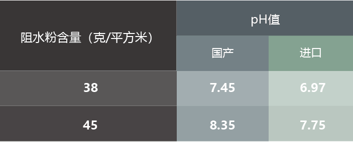 为了证明阻水粉含量与pH值的关系,我们做了二组典型的对比试验。一组是国产阻水粉不同含量的pH值试验,另外一组是同含量的国产阻水粉与进口阻水粉的对比试验,结果见表1。
