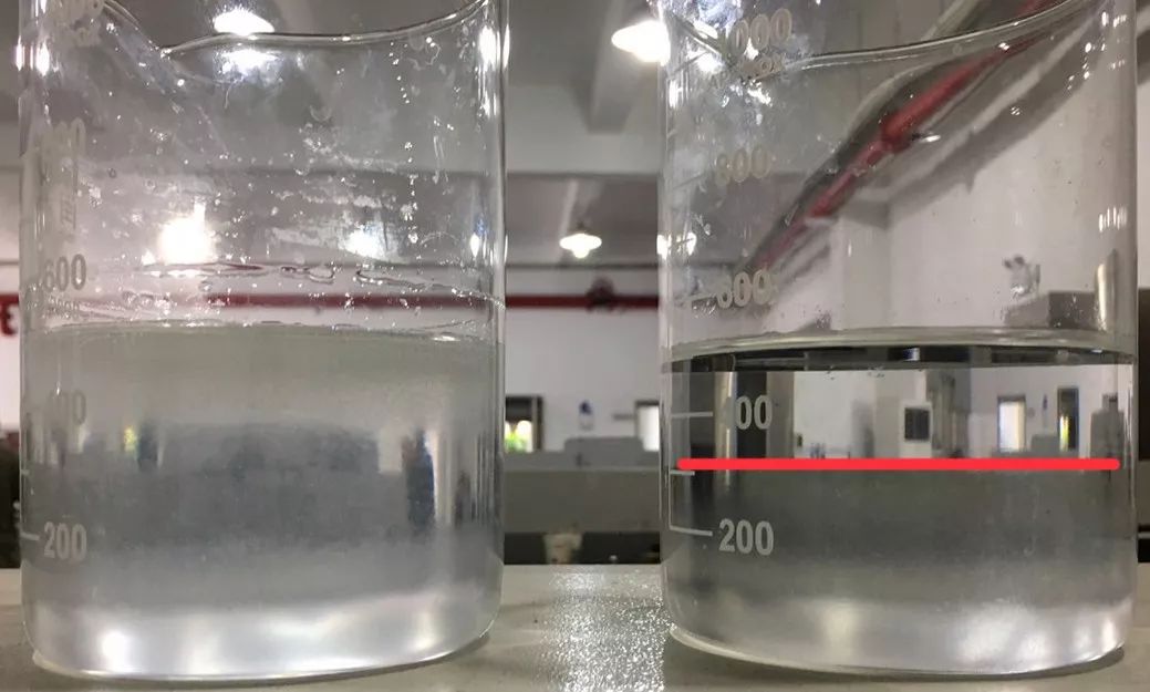 另外,国产和进口阻水粉溶解在水中的行为看,进口阻水粉溶解液均匀,国产阻水粉有分层现象,见图2。这种分层现象是不是与阻水效果有相关性,还需要深入研究。