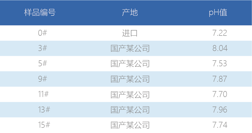 从表1中我们还可以看出,国产阻水粉与进口阻水粉的差异,在同量基础上,进口阻水粉的pH值明显优于国产的。