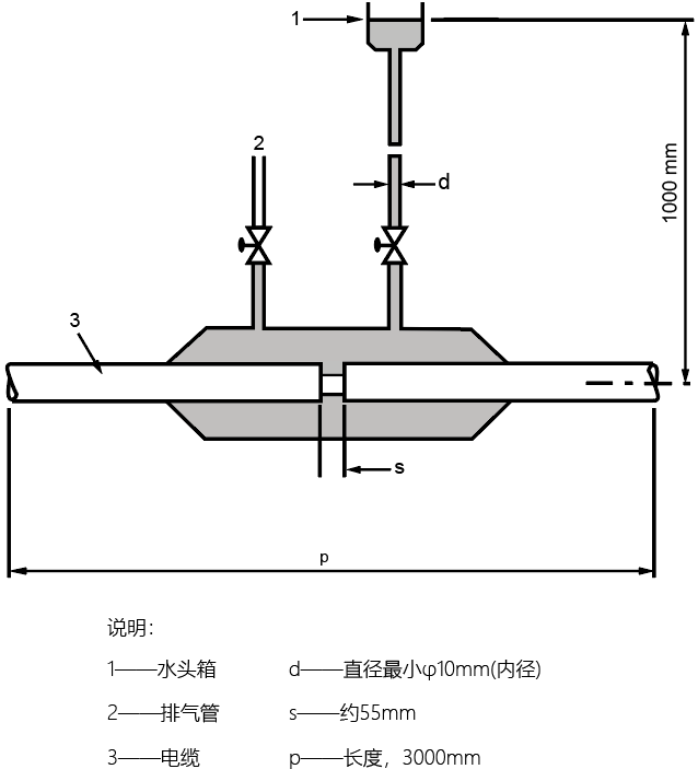 试验方法规定:应从经过弯曲试验后的电缆上截取一段3 m长的电缆,并水平放置。应在电缆中间部位切除一段宽约50mm的圆环。切除的圆环应包括绝缘屏蔽以外的所有各层材料。采用适当的装置(见图3),将一根内径至少为10 mm的管子垂直放置在切开的圆环上,并与外护套表面相密封。电缆穿出该装置处的密封应不在电缆上产生机械应力。