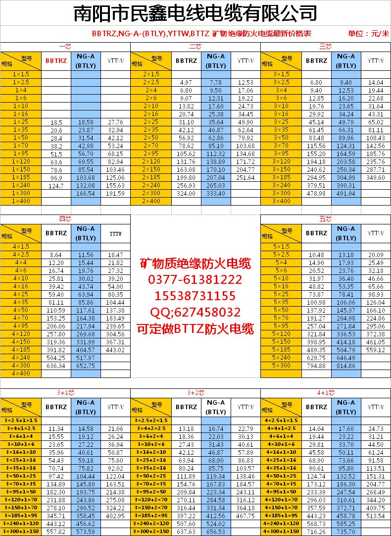 BBTRZ,NG-A-BTLY,YTTW矿物绝缘防火电缆厂家厂价批发最新价格。另有BTTZ电缆价格,需按当天铜价报价(完整版)