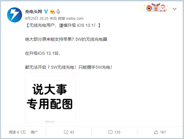 9月25日凌晨,iOS 13.1作为苹果最新iOS 13的第二个版本,带着修复众多系统BUG的使命如期到来。然而万万没想到的是,这个iPhone系统版本也将彻底改变整个无线充行业:它封杀了众多第三方苹果无线充,市面大批苹果无线充电器的7.5W模式纷纷失效,让苹果7.5W快充一夜回到5W。