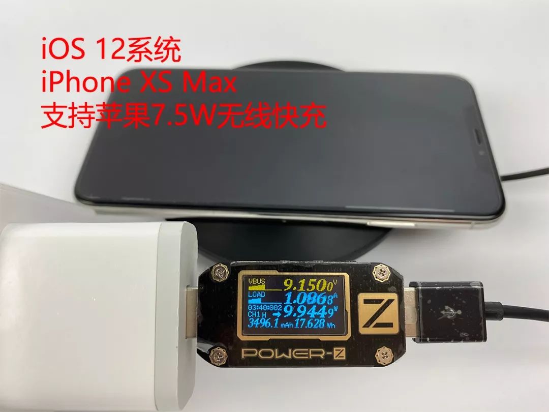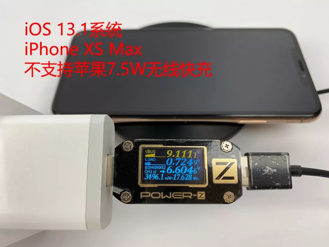 使用第三方无线充经过实测,iOS 12系统下iPhone XS Max支持苹果7.5W无线快充(输入端为10W左右,经过效率换算,最终无线充功率达到7.5W水平);而在升级iOS 13.1系统后,iPhone XS Max不支持苹果7.5W无线快充(输入端为6.6W左右,经过效率换算,最终无线充功率仅达到普通5W水平)。