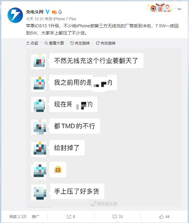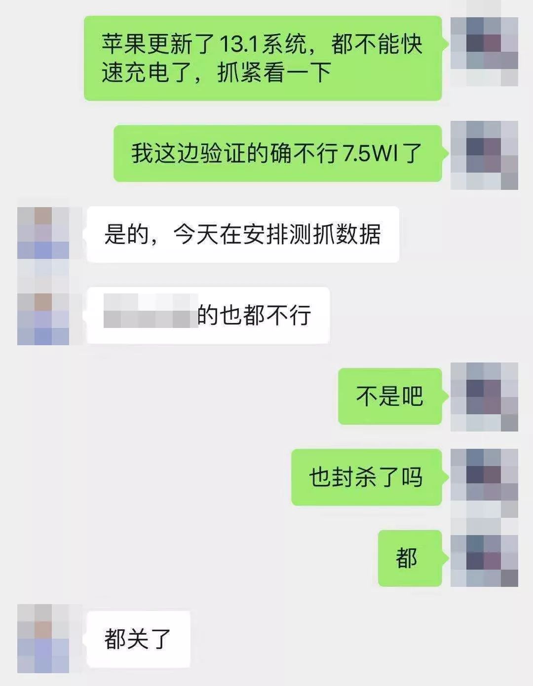 厂商表示无线充行业要翻天,自家多款产品都无法实现7.5W无线充,均被这次的系统封掉,损失惨重。