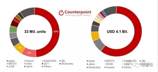 虽然国内的小米凭借廉价的小米蓝牙耳机Air、AirDots,以及Redmi AirDots的助力,在三季度的出货量上拿下了9%的市场份额,位居全球第二,但是其销售额在TWS市场仅排到了第八位。