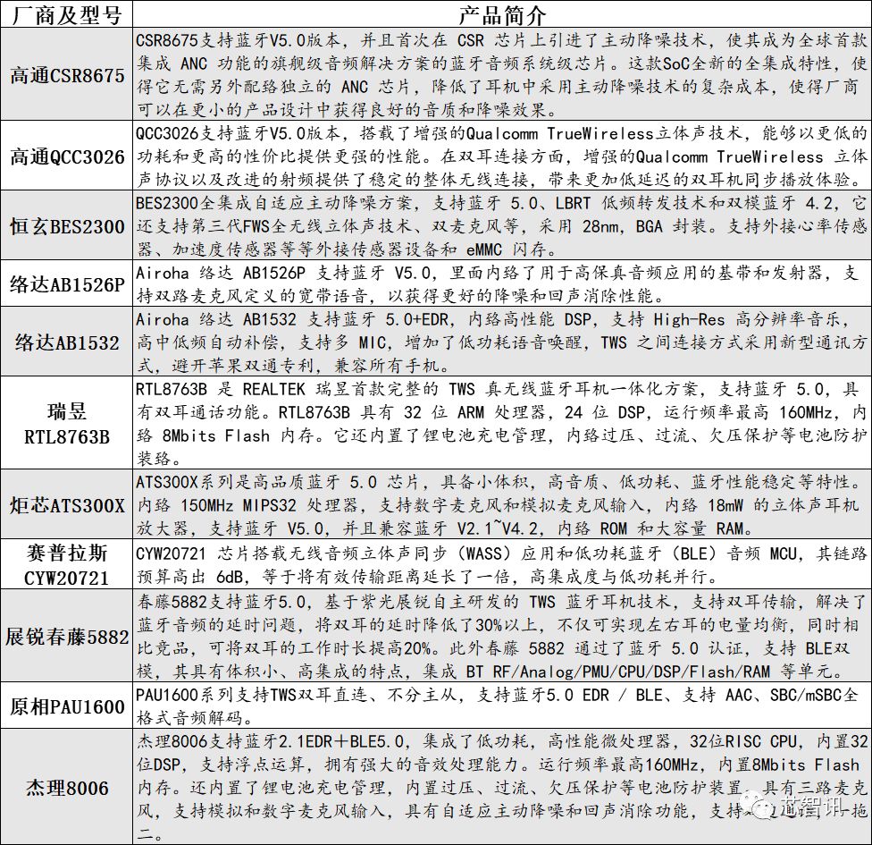 因此,各大芯片厂商也纷纷顺应趋势,推出了一系列支持蓝牙5.0标准的TWS无线蓝牙耳机芯片。