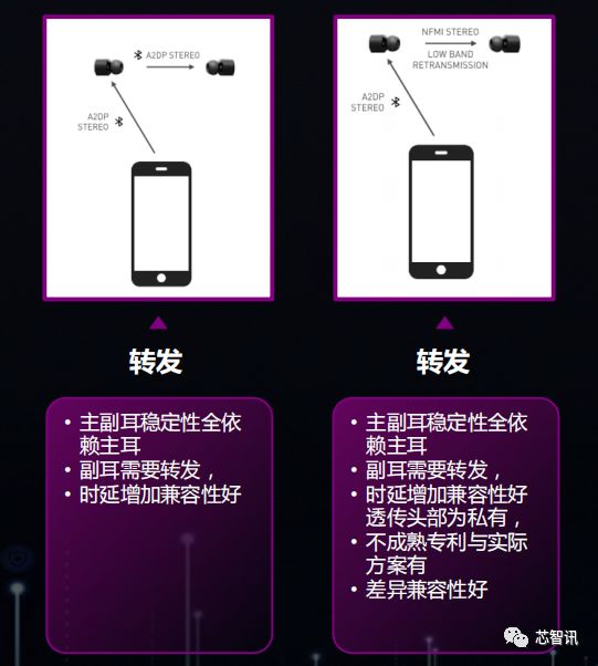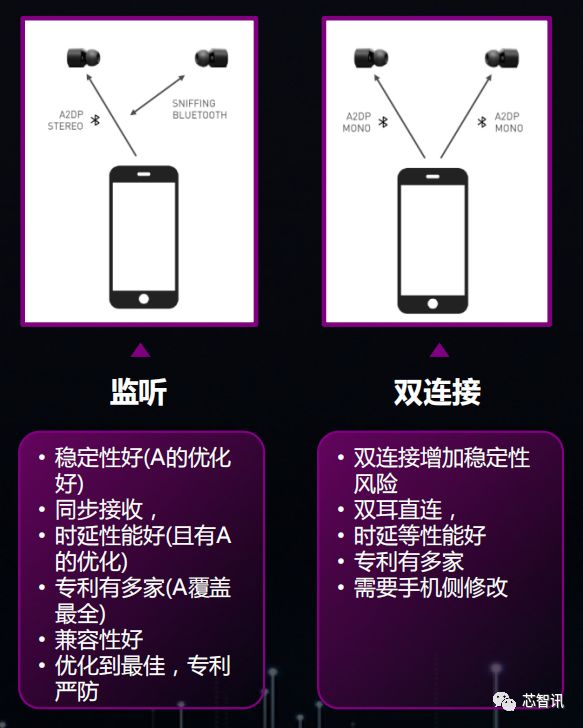而此前不分主副耳机的TWS联接方案主要有:苹果的监听方案和双连接方案。