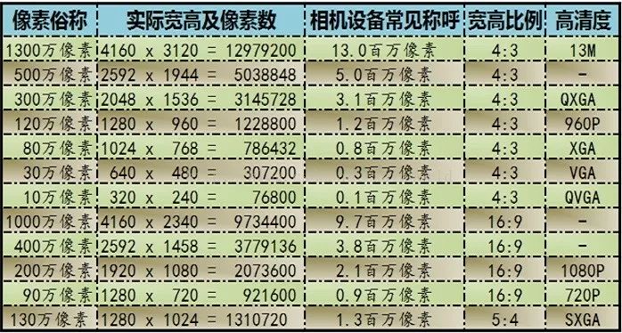 在使用手机的照相机设备或者数码相机设备时,一般自己是可以调整照片成像分辨率及比例的,我们一般采用上述标准去描述我们的分辨率,最近常常灌入耳中的720P、960P、1080P等分辨率都已经详细列出,下面是几种常见的相机像素,帮助大家明白对应关系.