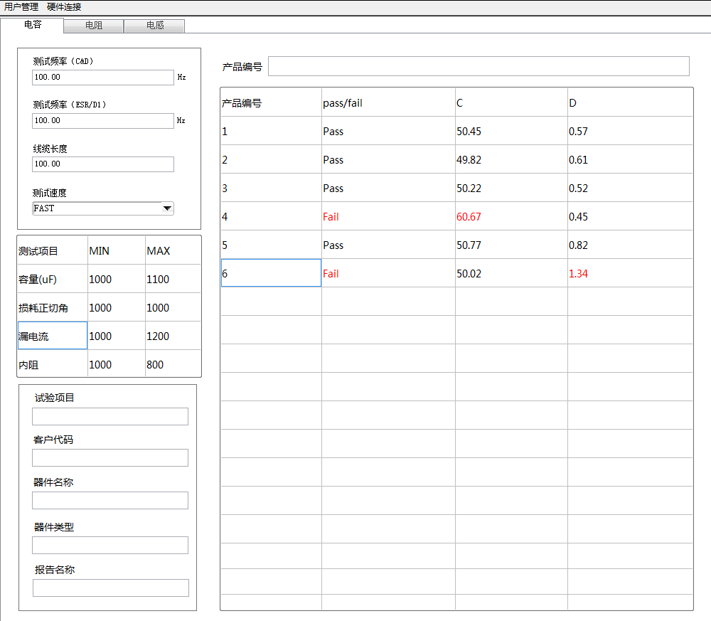 测试前用户需要对测试参数和产品信息分别进行配置和录入,完成配置后用户在界面右侧输入产品编号快捷的完成自动化测试,测试过程可在表格中实时查看,测试过程中若某项指标不合格则会红色显示。