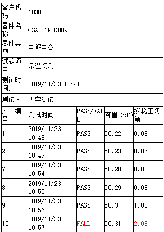 测试结束后,软件可以生成测试报告,报告的输出形式多样化用户可以自定义。报告中以产品型号,产品编号,测试时间和测试人员作为表头,之后是本次测试的全部测试数据,其中测试不合格项会进行红色提醒。
