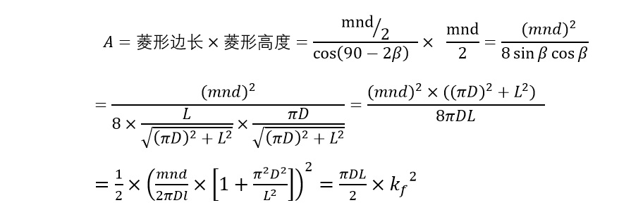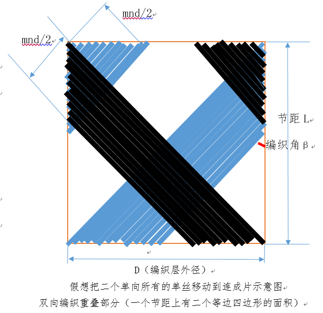 为了计算编织密度,我们把双向编织层进行如下图所示处理,由于二个单向编织层是对称的,可知在一个节距内编织丝重叠部分是一个等边四边形+二个一半的等边四边形。