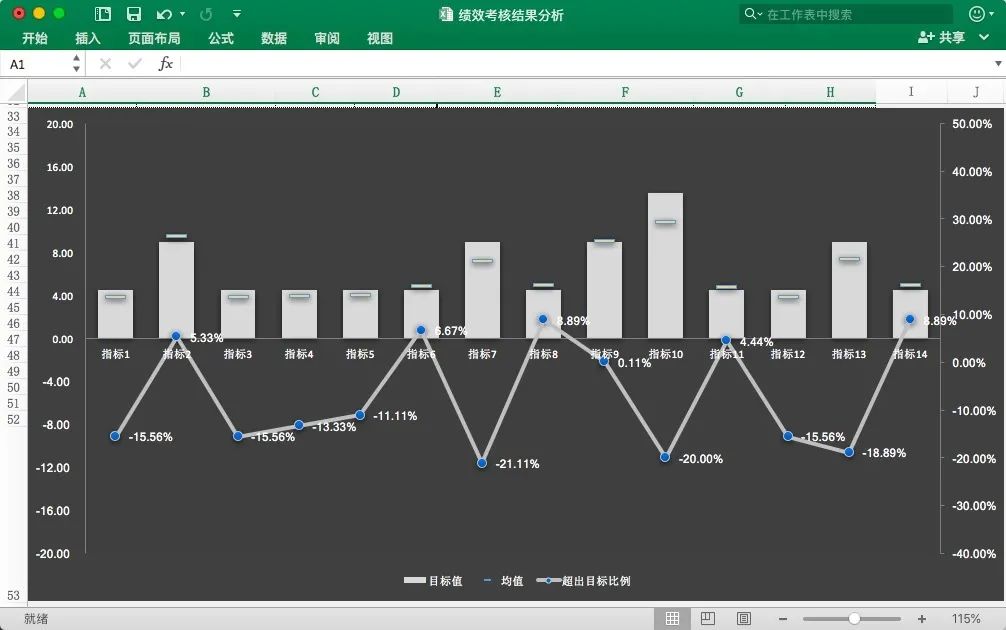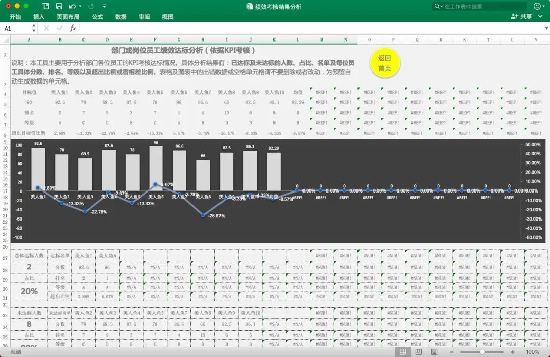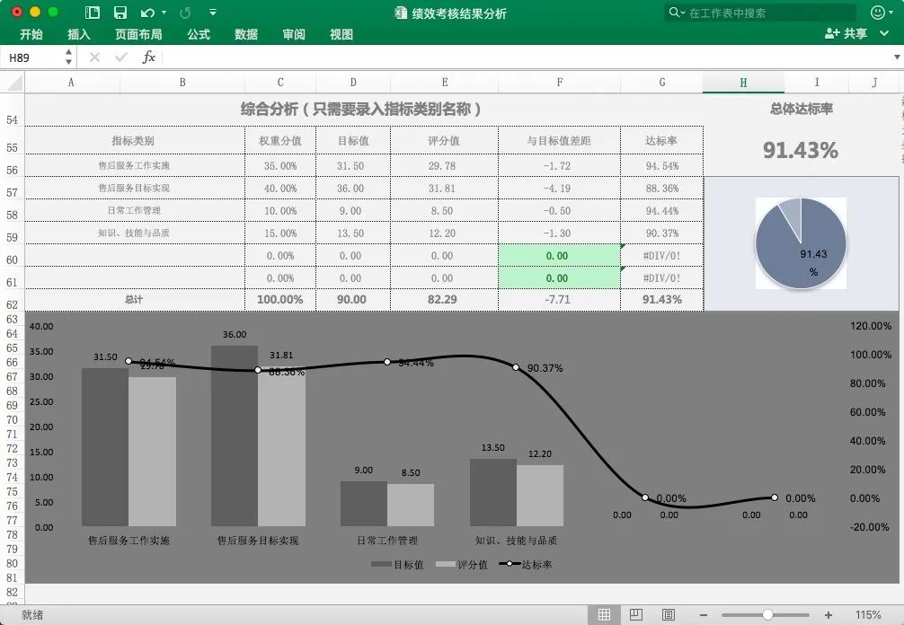 No.1 模板详情 这份Excel模板分四大板块:考核数据表、部门指标达标分析表、员工绩效达标分析表、员工绩效比较分析表。 1、考核数据表 这是绩效考核分析的表的基础数据表,需要手动录入,设置好指标内容及其权重值、评分等级标准,填入目标值以及评分值即可,其它数据为自动生成。 表中与目标值对比分析的数值若为负数,自动以红色醒目提示,正值则显示为绿色。 表格带详细的备注,不怕不会填。 2、部门绩效达标分析表 部门绩效达标分析表会自动分析: ?各项指标详细分析,即未达标指标项及已达标指标项明细; ?综合分析,即各指标类别与目标值对比分析及总体达标率。 分析结果会自动生成可视化图表: 3、员工绩效达标分析表 根据基础考核表数据,自动分析部门各位员工的KPI考核达标情况:已达标及未达标的人数、占比、名单及每位员工具体分数、排名、等级以及超出比例或者相差比例。分析结果自动以图表形式展示。 4、员工绩效比较分析表 自动分析部门内部员工之间的绩效差距情况:超出均值及低于均值的人数、占比、名单及每位员工具体分数、排名、等级以及超出比例或者相差比例。结果自动以图表的形式呈现。