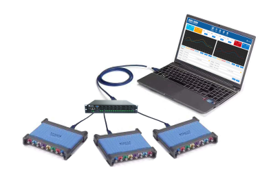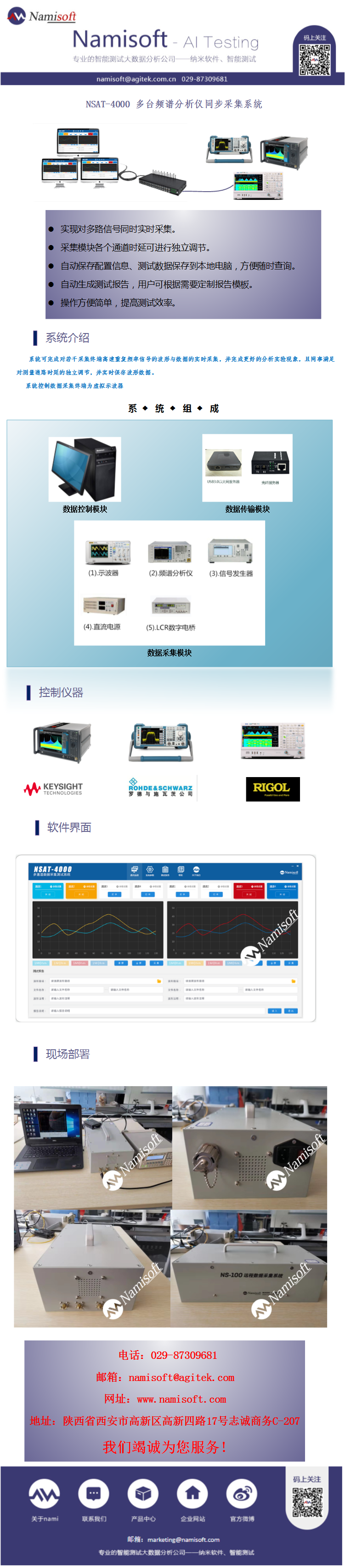 NSAT-4000多通道数据采集测试系统由控制模块(一般使用台式电脑或者笔记本)、数据采集模块(可以是多种采集模块如:多台示波器同步数据采集、多台直流电源同步数据采集、多台信号发生器同步数据采集、多台频谱分析仪同步数据采集、多台LCR数字电桥同步数据采集等)、数据传输模块(可以是各类传输转换设备如:光纤收发器)三部分组成,其中控制模块通过IP地址访问指定的采集模块不仅实现了信号的波形与数据的实时采集,各个测量通路的时延可以独立调节,同时为了方便实验人员,还提供了保存多路数据和生成测试报告的功能。