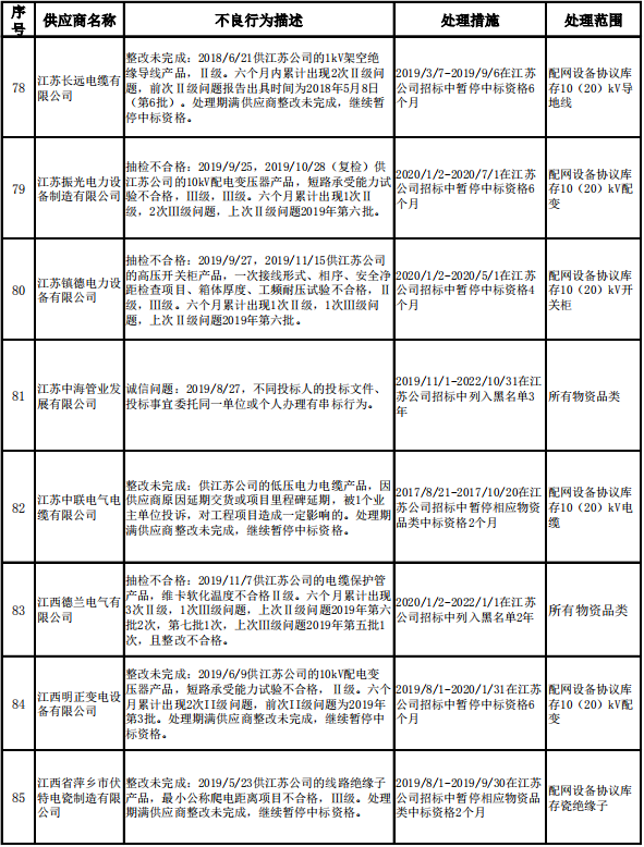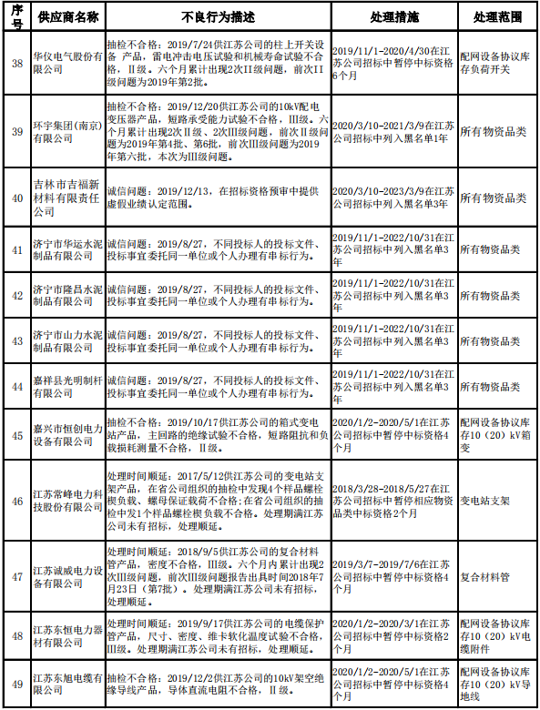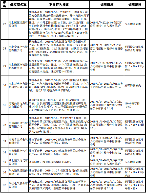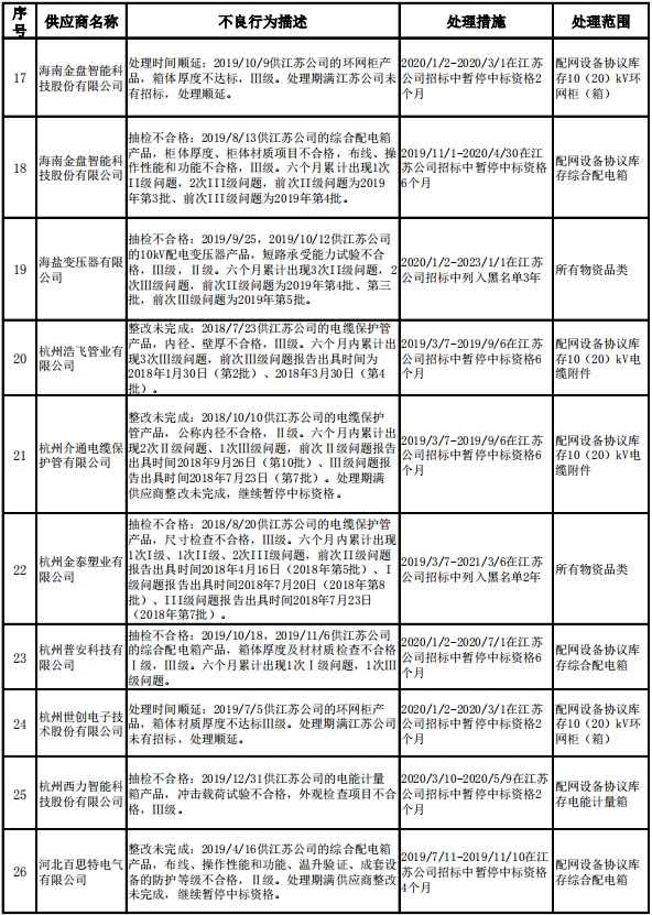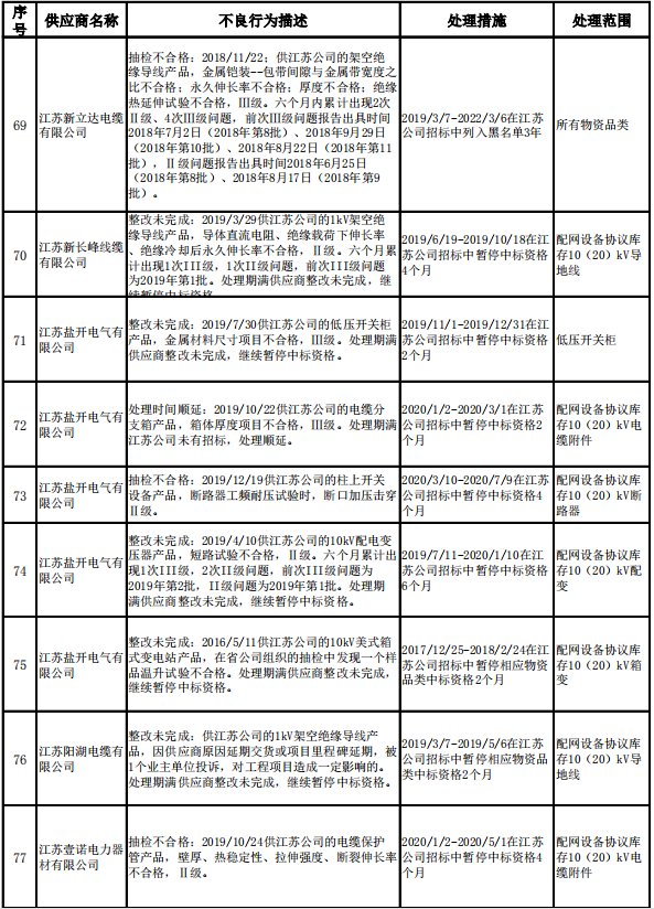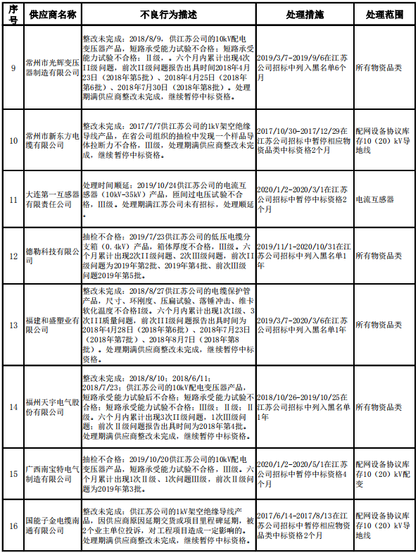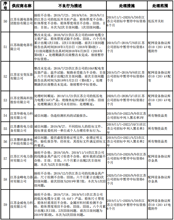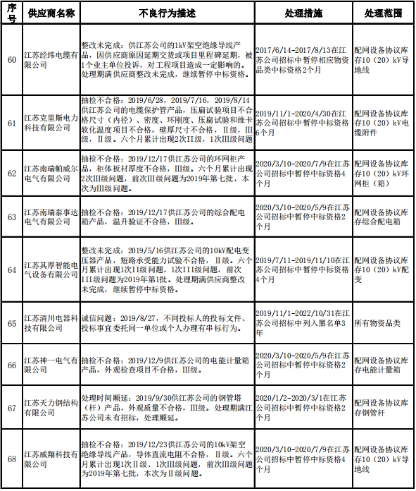 九、国网江苏省电力有限公司关于供应商不良行为处理情况的通报(2020年3月)