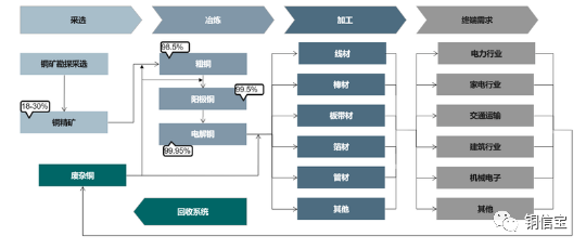 首先我们来看一下铜产业链划分:主要分为采选、冶炼、加工和终端需求。