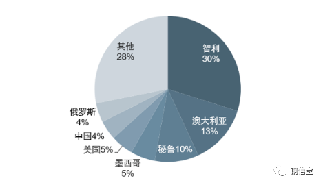 全球铜矿产资源储量约为70000 万吨(金属吨),主要分布在智利(30%)、秘鲁(10%)、澳大利亚(13%)、墨西哥(5%)、中国(4%)等国家。世界顶级铜矿(铜金属资源储量≥3000万吨)共11个,有6个分布在智利,其余的分布在印尼、蒙古、美国、俄罗斯和澳大利亚5个国家。