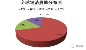 2019年全球电解铜消费量约为2346万吨,主要分布在亚洲(70.2%)约1647万吨其中中国为1248万吨(占亚洲的75.8%、全球的53.2%)、美洲(12%)约为282万吨其中美国181万吨(占美洲的64.5%、全球的7.7%)、欧洲(17%)约为398万吨,非洲和大洋洲合计1% 。
