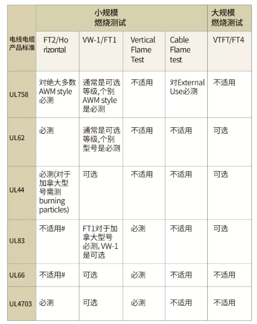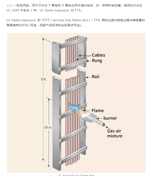 b, 中压电力电缆UL1072 /托盘控制线缆UL1277/金属铠装线缆UL1569/铠装线缆UL4电力电缆/热固性绝缘线缆UL44(线缆标识ST1时) /热塑性绝缘线缆UL83(线缆标识ST1时),这几类线材只要求UL1685 / FT4大型成束燃烧。