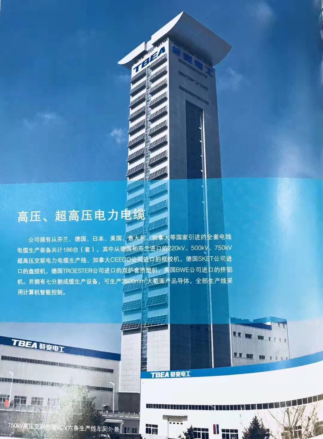 为适应绿色经济发展模式的需要,特变电工投资35亿元建设了电压等级高、产销规模大的集超高压电缆、特种电缆和电缆附件研发于一体的电缆高科技产业园,产业园内新建了180米立塔一座,配备了先进、自动化程度高的750 kV、500 kV、220kV等六条超高压进口立式交联生产线,实现了超高压、高压交联集成技术发展史的重大突破。