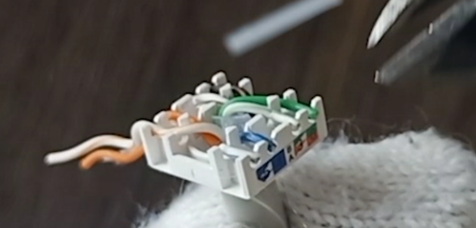 (3)用剪线钳剪去网线中多余的部分,整理好网线,然后套进打线盖中,按照T568A/T568B线序进行压线,将多余的部分剪掉。