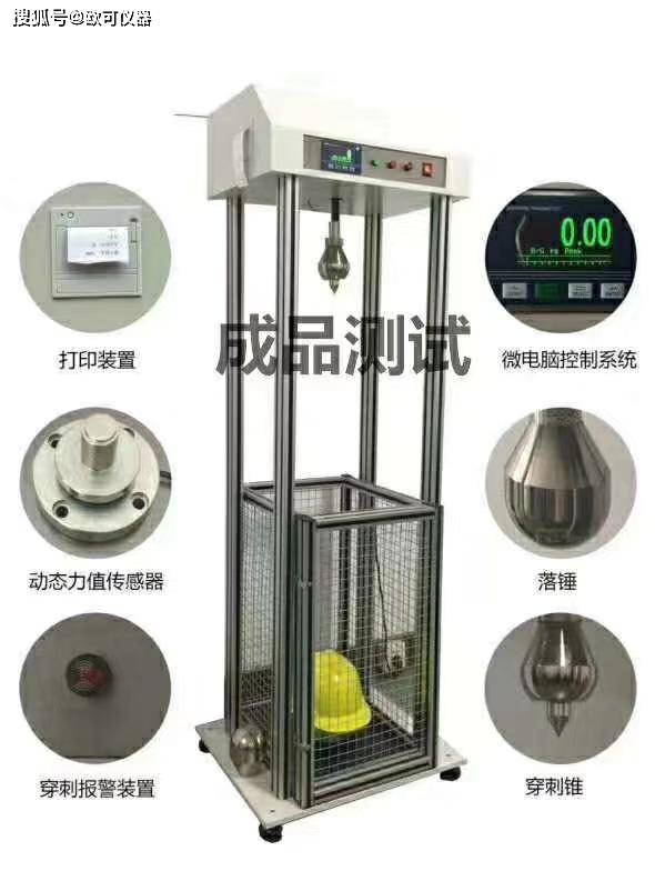 本仪器专用于检测安全帽耐冲击吸收性能和穿刺性能。安全帽的耐冲击吸收性能测试中,将测力传感器刚性的安装在头模与底座之间,经过预处理后的安全帽戴在头模上,然后用质量5kg的落锤从1m的高度自由下落冲击安全帽,由高灵敏度的力值感应装置测出冲击瞬间的力值,据此判断安全帽冲击吸收性能。安全帽的耐穿刺性能测试中,用3kg的穿刺锥自1m高度自由下落冲击安全帽,接触穿刺后,接触指示器发出报警指示,判断安全帽是否穿透。可供检验部门和科研单位等使用。