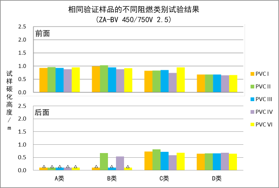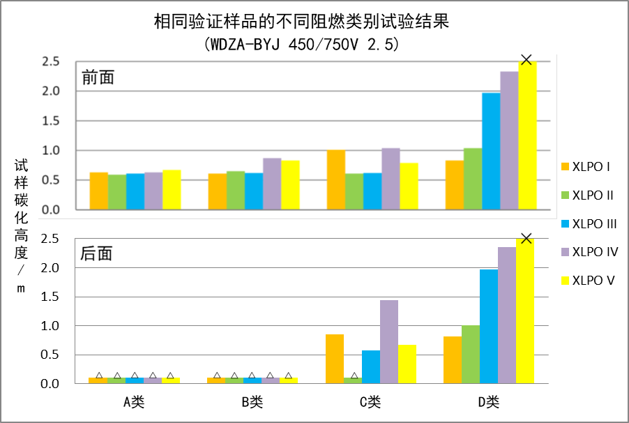 考虑到不同类别阻燃测试的判定均为:试样上的炭化范围不应超过喷灯底边以上2.5 m。若按照惯性理解中的阻燃A类阻燃性能优于(覆盖)B类、C类至D类,也即认为成束阻燃试验的严苛程度排序为A>B>C>D,则可推理,同一样品经受不同阻燃类别的试验后,反映火焰延燃情况的碳化高度指标应显示出A>B>C>D的规律。