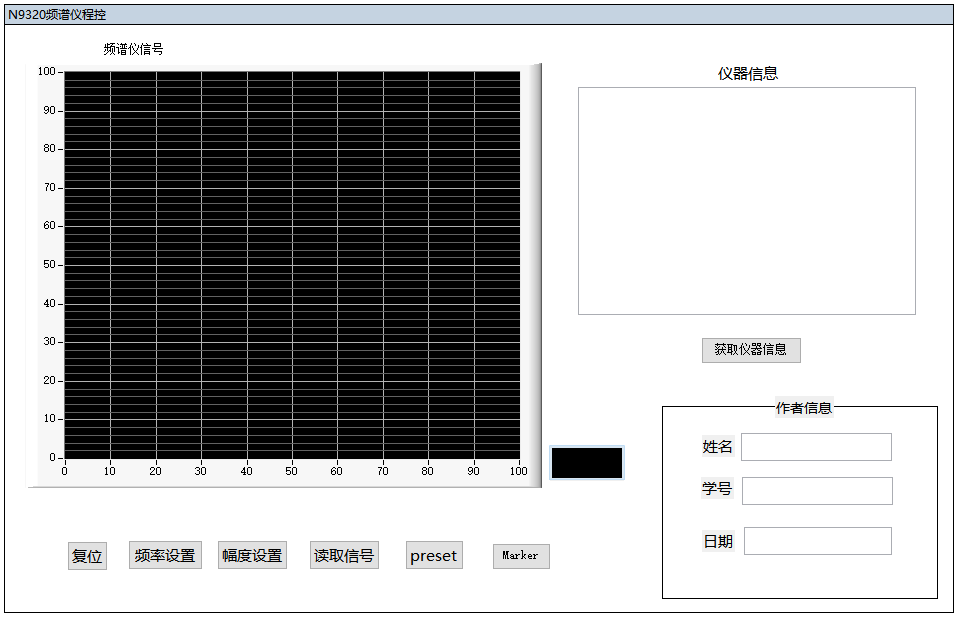 运行频谱仪程控软件进入“主界面”,点击进入复位,频率,幅度设置、读取信号等界面,完成自动化数据读取。