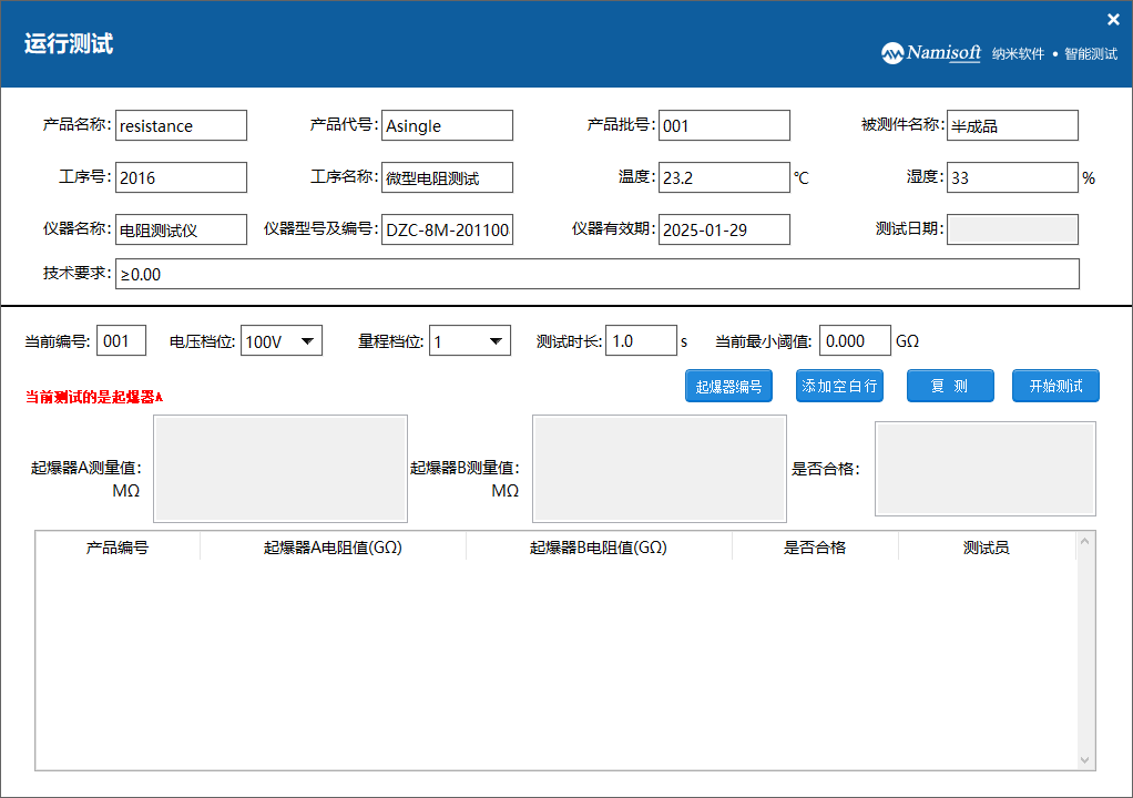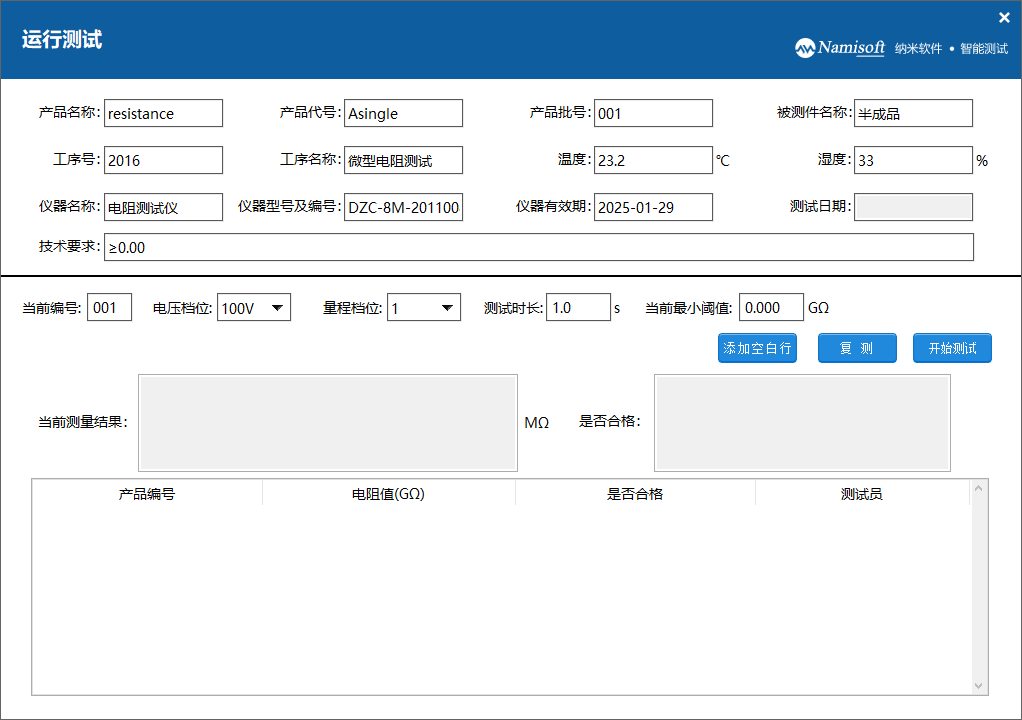 进入单电阻测试界面后,首先应该认真填写测试信息,测试信息填写无误后点击开始测试按钮或者踩踏脚踏开关来触发一次的电阻测试任务,直至测试任务完成退出测试界面。