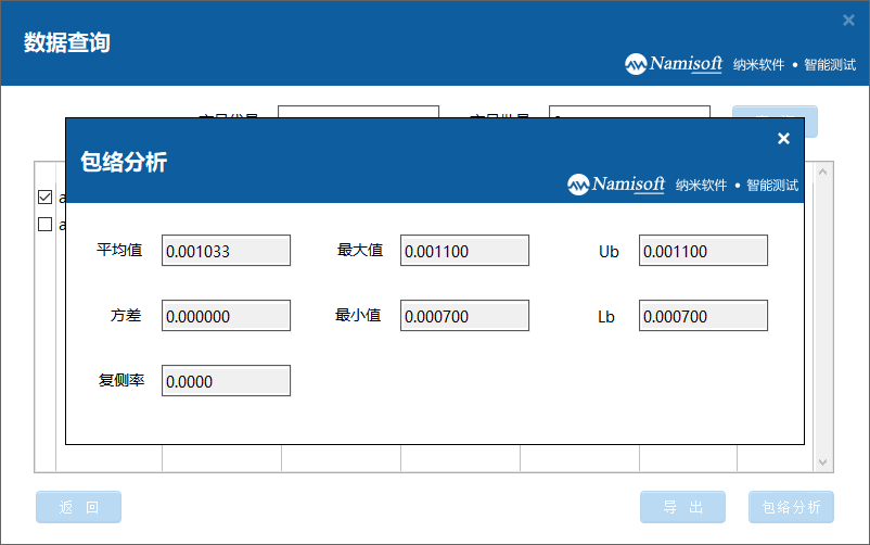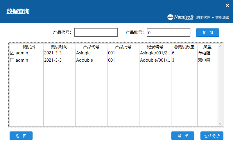 历史数据查询:软件会将测试数据保存至数据库,用户可根据产品代号或产品批号在数据查询界面进行历史测试数据查询。