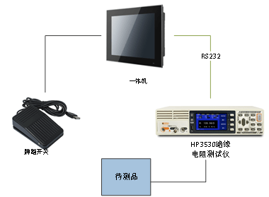 绝缘电阻测试系统由防爆一体机、HP3530绝缘电阻测试仪、待测绝缘电阻及脚踏开关组成。
