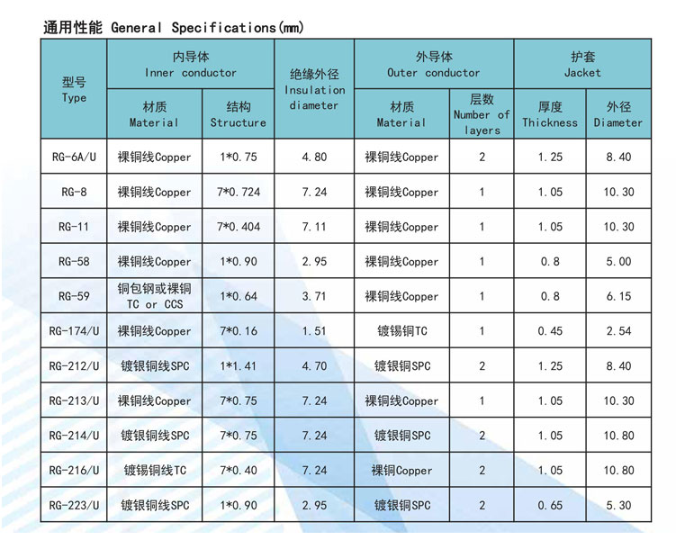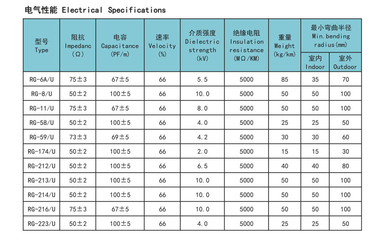 RG系列射频同轴电缆技术参数 - 无图版